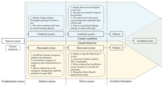 The Zhengzhou subway flooding accident (referred to as Zhengzhou Metro accident hereinafter) was caused by a combination of factors. The complexity of the urban rail transit system [] and the meteorological disaster created a dynamic and nonlinear interaction of multiple systems, such as human behaviors, urban technical facilities, and organizations, influenced by the natural environment. This interaction ultimately led to the accident. To better understand the causes of the accident, this paper uses several models, including the Swiss cheese model, Surry’s model, and trajectory crossover theory to conduct a comprehensive analysis. These models allow this study to gain a more realistic understanding of the factors that contributed to the accident and identify any weaknesses or vulnerabilities in the various aspects of the urban system in response to this weather disaster.