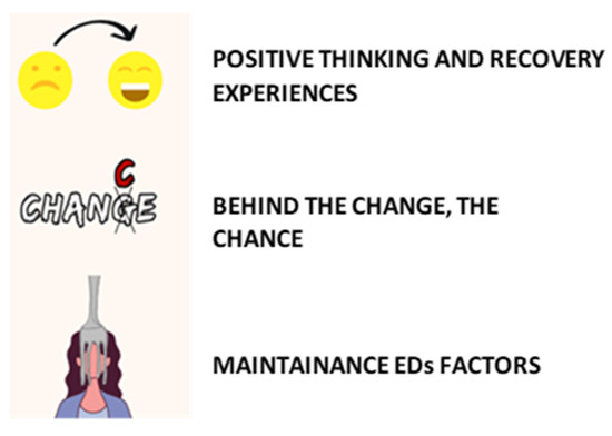 Through the Instagram profile, scientific contents related to eating disorders are published in the shape of posts, stories, or reels on a weekly basis. The proposed contents are written by PhD and Masters students of the team and then supervised by the clinical psychologists of the group (GA, GL, and SG). During the weekly supervision, the contents are examined to guarantee adherence and congruence with the literature in the field. Several topics are tackled and basically, they are related to three main areas connected to EDs: (1) positive thinking, (2) the importance of change (motivation), and (3) the maintenance factors of an ED. These macro areas are conveyed through three different icons (which are represented in Figure 1) aimed at anticipating the contents published. The main idea behind the definition of these icons is to try to organize the knowledge and learning provided. The purpose was to use the social language of young people, offering vicarious learning thanks to the evidence-based contents shared.