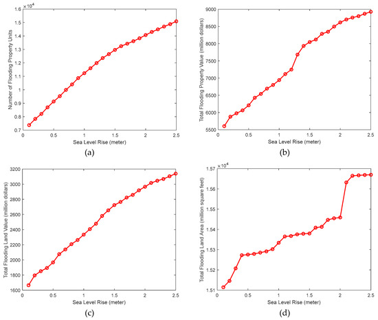 Flooding property analysis with the rise in sea level: (a). number of flooding property units, (b). total flooding property value (million dollars), (c). total flooding land value (million dollars), and (d). total flooding land area (million square feet).