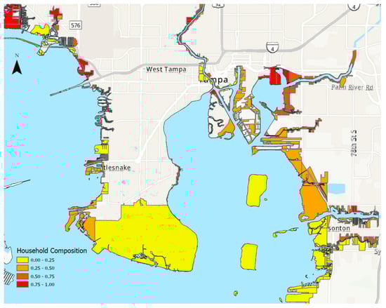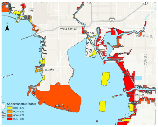 Our PCA–AHP results also show that most of the highly vulnerable residents who are usually associated with a low income, mobile home, unemployed, and minority residents live in the East Tampa shore, compared with the residents living in the West Tampa shore. Although all these flooding areas with high and low social vulnerability are near to the coast, we find that the high social vulnerability areas are typically surrounded by wetlands or industrial fields that have long distances to the beach, but conversely, the low social vulnerability communities are in the area with open water resource or easy access to the well-developed beach.