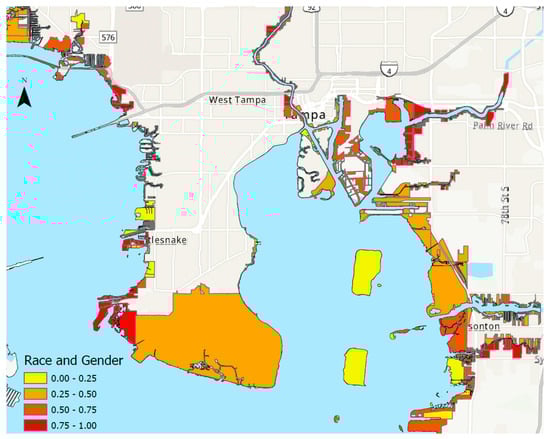The overall SVI can be computed from the percentile ranks of the four themes using an across-the-board sum method with weights computed by the AHP method. Figure 12a maps the overall SVI across the areas which are projected to be flooded when the sea level is raised 1 m. It can be observed that: First, the East Tampa shore is dominated by high overall SVIs, except for several areas, including the Kitchen Nature Preserve and the Fred and Idah Shultz Nature Preserve, with very small populations. Second, while most areas in the West Tampa shore have low overall SVIs, several areas including Bay Crest Park and the Bayside West have high social vulnerability mainly due to the high percentage of senior people who are vulnerable against flooding disasters, although they may have high income. Lastly, we observed that some themes play an important role in the calculation of the overall social vulnerability for some areas, particularly the race and gender theme, which has the largest weight toward the overall SVI. For example, we have seen that Port Tampa (the most southwest of the map) has a high overall social vulnerability because of the high social vulnerability for the theme of socioeconomic status and the theme of race and gender.