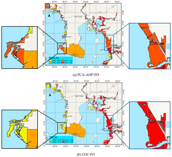 In this subsection, we compared the overall social vulnerability index obtained by our integrated PCA–AHP SVI method with the traditional CDC SVI method. Since the CDC SVI measures the social vulnerability in a structure shown in Figure 1b using an across-the-board sum of the percentile ranks of all four themes where all themes have the same weight to the overall SVI, some important social groups could be underestimated in its overall CDC SVI results, particularly the minorities that are emphasized in our PCA–AHP SVI method. Here, we show the overall CDC SVI for the flooded areas in Figure 12b. Compared with our PCA–AHP SVI results shown in Figure 12a, it shows that the overall CDC SVI is generally lower than the overall SVI in flooded areas of the West Tampa shore. For example, Port Tampa (the most southwest of the map) has a very low overall CDC SVI but exhibits a high overall PCA–AHP SVI. The reason for such differences between CDC SVI and PCA–AHP SVI is that Port Tampa is composed of a large population of minority groups.