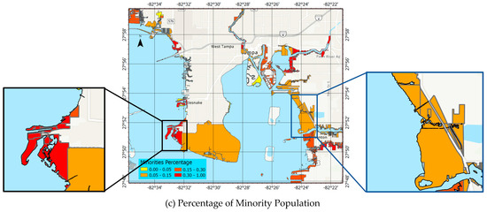 To better illustrate this, we created a map to show the distribution of minorities in the study area. In Figure 12c, the percentage of the minority population is categorized into four groups using the natural break method. Port Tampa has a very high minority population (as shown in the left figure of Figure 12c), but the CDC SVI (the left figure of Figure 12b) results in the lowest vulnerability values, which means CDC SVI significantly underestimates the highly aggregated minority communities in Port Tampa. However, our PCA–AHP method (the left figure of Figure 12a) estimates high SVI values for Port Tampa. Similarly, in the northwest of Bay Crest Park, the vulnerability is also significantly underestimated. On the other hand, the CDC SVI method significantly overestimated vulnerability in other Tampa coastal areas; for example, an obviously overestimated big community area is the central East Tampa shore district with a low percent of minorities, but the CDC SVI method resulted in the highest vulnerability values. In contrast, our PCA–AHP obtained reasonable lower SVI for this district. In CDC SVI, the minority is just one vulnerability indicator in the theme of minority status and language, and hence its contribution to the overall SVI could be easily canceled out by many other indicators; an example of this is the language indicator, given the fact that African Americans can speak English well. In our PCA–AHP SVI, race is reasonably assessed and weighted by experts as one of the main indicators to the calculation of the overall SVI. Interestingly, both CDC SVI and our PCA–AHP SVI share only one similar pattern of social vulnerability in the Northeast Tampa shore, where the percentage of minority populations is high, because the vulnerability of this area is also highly influenced by the population with a low socioeconomic status (i.e., Figure 8) and high special family needs (i.e., Figure 11). It further reveals that East Tampa consists of 69% minorities in all sea level rise flooding areas, while West Tampa has the remaining 31% minorities.