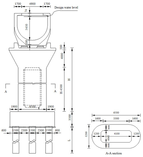 According to the test conditions, the length similarity ratio of the test model is determined to be 1:16. According to the length similarity ratio, an ideal model can be designed. However, if the similarity ratio is completely satisfied, there will be some problems that are difficult to cope with. For example, the diameters of the steel bars and the thicknesses of some concrete components will be too small to be fabricated. Therefore, the ideal model needs to be reformed to a test model according to equivalence principles. For instance, the superstructure of the test model is a Q235 I-shaped steel beam with some additional mass blocks according to the stiffness and mass equivalence principles [40]. The pier section of the test model is a filled rectangle, as shown in Figure 5.