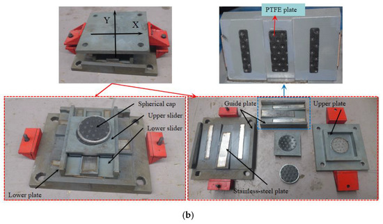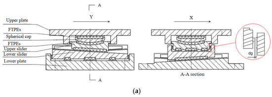 An expansion IPGB consists of five components, and they are, from top to bottom, an upper plate, a spherical cap, an upper slider, a lower slider, and a lower plate, respectively. Details of the bearing’s structure are shown in Figure 3. The upper plate, spherical cap, and upper slider form a spherical bearing to meet the rotation requirement of the bearing.