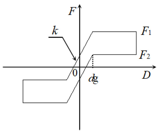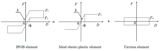 The displacement–force relation of an IPGB cannot be simulated by a single element in existing finite element software. An ideal elastic–plastic element and a friction element are connected in parallel to simulate the IPGB connection element in this paper, as shown in Figure 16. The pre-yield stiffness of the ideal elastic–plastic element is provided by the yield force of the ideal elastic-plastic element is provided by , and the yield force of the friction element is provided by .