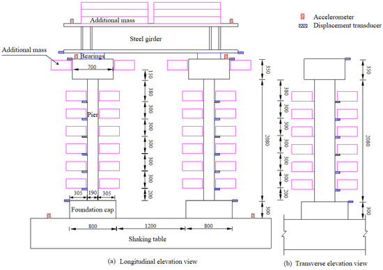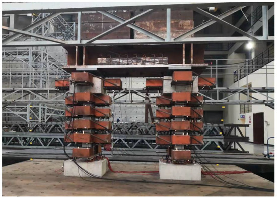In the test, the displacement of the pier and the bearing, the horizontal force of the bearing, the structural acceleration, and the reinforcement strain in the plastic hinge area of the pier bottom were measured. The additional mass blocks and the transducers of the test model are shown in Figure 6, and the photo of the test model is shown in Figure 7.