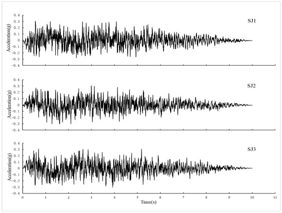 Three earthquake excitations, named SJ1, SJ2, and SJ3, are artificially generated and input along the longitudinal direction. The compressed acceleration time histories are shown in Figure 8. In the shaking table test, the peak ground acceleration (PGA) of the earthquake excitations are scaled from 0.1 g to 0.75 g. These excitations correspond to seismic intensities of frequent earthquakes, design earthquakes, and rare earthquakes, respectively. Several white noise cases with a PGA of 0.05 g are also arranged to determine the state of the test model. All of the test cases are listed in Table 3.