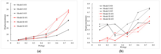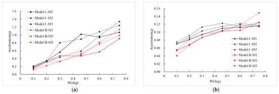 The maximum acceleration responses of the two models are shown in Figure 9. The acceleration responses of the pier tops increase with the PGAs, and the pier acceleration responses of Model II are less than those of Model I because of the minor horizontal stiffness of Model II. The girder acceleration responses of the two test models are relatively close and there is little change.
