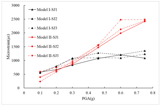 Maximum reinforcement strains at the pier bottom for all the cases are shown in Figure 13. The reinforcement strain at the pier bottom of Model I remains nearly unchanged for cases of a PGA of ≥0.3 g. However, the reinforcement strain at the pier bottom for Model II increases with the PGA. The maximum reinforcement strains at the pier bottom for Model II are greater than 2000 με for the cases of a PGA of ≥0.6 g, and the pier has entered a slightly plastic state. It is demonstrated that the aqueduct’s seismic performances for Model I and Model II are quite different.