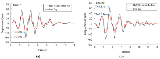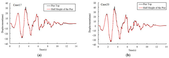 Displacement time histories at the top and half-height of the piers in Model I and Model II for cases 17 and 20 are shown in Figure 14 and Figure 15, respectively.