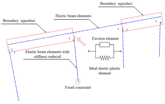 The girder of the aqueduct is simulated by elastic beam elements. The simulation methods of the reinforced concrete pier include a fiber beam element [42,43], an elastic beam element with reduced stiffness [44], and an elastic beam element with a plastic hinge. The aqueduct in this paper adopts the seismic isolation system, and the pier has no residual cracks after the test, which indicates that the pier is basically in an elastic state during earthquakes, and so the elastic beam element with a reduced stiffness is used to simulate the pier in this paper. The pier stiffness is reduced according to the AASHTO specification [45]. The reinforcement ratio and the axial compression ratio of the pier are 0.03 and 0.32, respectively, and so the reduction coefficient of the pier stiffness is 0.6.