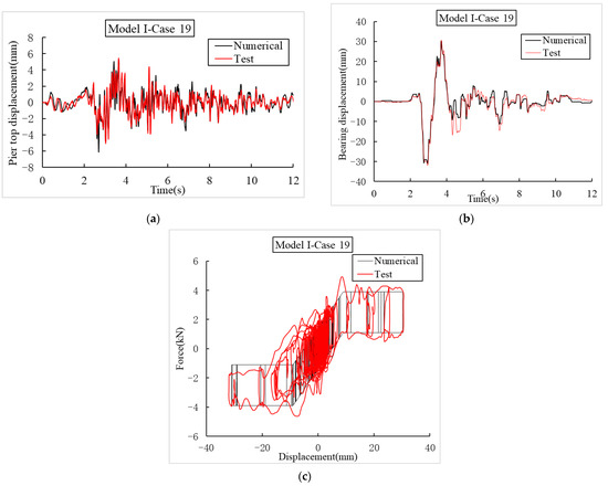 Comparison between the numerical and test results of Model I for case 19. (a) Time history of pier-top displacement. (b) Time history of bearing displacement. (c) Hysteresis curve of the bearings.