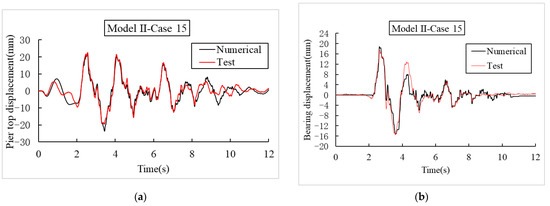 As shown in Figure 18 and Figure 19, the simulation results of the time–history curve of the pier top displacement and the bearing displacement are highly coincident with the test results, and the simulation results of the bearing hysteresis curve are largely consistent with the test results. The maximum errors of pier-top displacement, bearing displacement, and bearing force are 3%, 6%, and 17%, respectively. The numerical simulation method proposed in this paper is applicable for aqueducts that use IPGBs with different pier heights in different test cases.