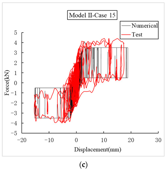 Comparison between the numerical and test results of Model II for case 15. (a) Time history of the pier-top displacement. (b) Time history of the bearing displacement. (c) Hysteresis curve of the bearings.