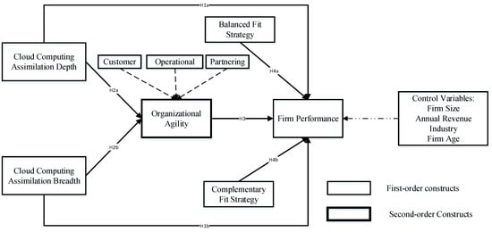 In addition, Chang et al. [] reveal that cloud computing supports a balanced IT ecosystem that enhances firms’ cloud computing absorptive capacity. Such absorptive capacity allows firms to face challenges at the assimilation stage of cloud computing []. Accordingly, a balanced fit between these two dimensions enables firms to utilize cloud computing services to their fullest for enhancing firm performance. Therefore, we posit the following hypothesis.