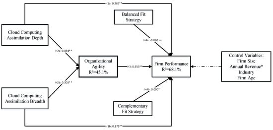 Structural model analysis was employed to test the hypothesized relationships between constructs. The hypotheses results are depicted in Figure 2. The model explained 68.1% of the total variation in firm performance through the depth of cloud computing assimilation (β = 0.285, p < 0.01), breadth of cloud computing assimilation (β = 0.175, p < 0.01), organizational agility (β = 0.553, p < 0.01), and complementary fit strategy (β = 0.090, p < 0.05), which were statistically significant, but the balanced fit strategy (β = −0.060, p > 0.05) was not; respectively, hypotheses H1a, H1b, H3, and H4b are confirmed, but H4a is not.