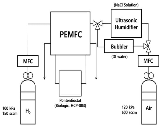 Figure 1 illustrates the piping and instrumentation drawing of the experimental setup. In this study, a custom-made mist generator was prepared using an ultrasonic vibrator. A mist of 3.5 wt.% NaCl solution was supplied using air blown by a mist generator. As shown in Figure 1, the mist generator was located between the fuel cell and the mass flow controller (MFC). The concentration of the NaCl solution was maintained at 3.5 wt.%, which is the average concentration of seawater. Then, 150 sccm of dry H2 (Samjung energy, Paju-si, Republic of Korea) was supplied to the anode side of the fuel cells, and 600 sccm of humidified air (Samjung energy, Paju-si, Republic of Korea) was supplied to the cathode of the fuel cells. The humidification of NaCl solution was conducted using a custom-made mist generator. The regeneration was carried out using a bubbler with DI water.