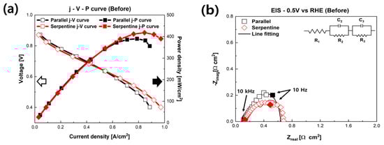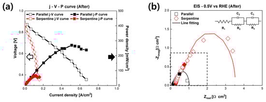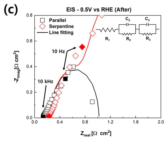 Figure 2 presents the polarization curves of fuel cells humidified with NaCl solution with different flow fields. Figure 2a shows the initial performance of PEMFCs humidified with NaCl solution. As shown in Figure 2a, the initial performances of the fuel cells were dependent on the flow field. The maximum power density of the PEMFCs with the serpentine flow field was 419.5 mW/cm2, and the maximum power density of the parallel flow field was 391.78 mW/cm2. We assumed that these results were caused by the different flow fields rather than the NaCl solution [,,]. As mentioned above, the effect of Na+, i.e., replacing H+ in the ionomer, is related to ohmic resistance, which is generally shown in an intermediate current region []. Moreover, the increase in activation resistance related to a decrease in TPBs, which is caused by Cl, is typically shown in a low current region []. However, in Figure 2a, the difference between the low current region and the intermediate current region is negligible. Interestingly, the high current region shows a discernible difference. It is generally known that it is more challenging to remove liquid water in the parallel flow field structure than the serpentine flow field structure because of pressure loss. In order to evaluate more detailed electrochemical behavior, the EIS of the fuel cells was measured at 0.5 V. Figure 2b shows the Nyquist plots of the fuel cells. In the EIS results, the ohmic resistance of the fuel cells is represented from the origin to the point where the semicircle starts at the high-frequency area. Additionally, faradaic resistance is represented by the size of the semicircle, which is generally shown from the intermediate to low-frequency area []. The initial EIS results according to the flow field of the PEMFCs humidified with NaCl solution are shown in Figure 2b. The ohmic resistance of the PEMFC with the parallel flow field was measured at 0.117 Ω∙cm2, and the faraday resistance was measured at 0.518 Ω∙cm2. The ohmic resistance of the PEMFC with serpentine flow field was measured as 0.128 Ω∙cm2, and the faraday resistance was measured as 0.532 Ω∙cm2. There were negligible differences in both ohmic resistance and faradaic resistance in the initial performance according to the design of the flow field.