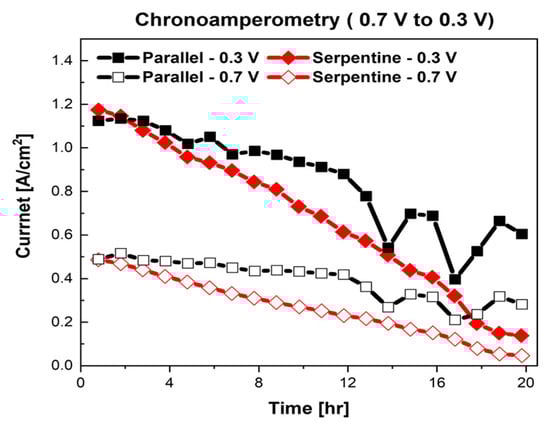 Long-term durability evaluation was performed after the characterization of the fuel cells. The chronoamperometry method was applied for 20 h. The results of chronoamperometry are shown in Figure 3. As shown in Figure 3, the current of the PEMFC with the parallel flow field decreased from 1.124 to 0.604 A/cm2 (−0.52 A/cm2, 46.26%) at 0.3 V and from 0.488 to 0.282 A/cm2 (−0.206 A/cm2, 42.21%) at 0.7 V, respectively. Interestingly, the fluctuation of the performance, i.e., the current, was observed at the fuel cell with the parallel flow field. We believe that this sudden fluctuation in the performance of the fuel cell was caused by the liquid water in the parallel flow field. The accumulated liquid-water-related performance fluctuation in PEMFCs has been reported in prior research [,,,,]. As previously mentioned, the parallel flow field has an inherent weak point in the removal of liquid water []. Therefore, accumulated liquid water, generated during chronoamperometry measurement, blocked the supply of air, and then, the performance of the fuel cell was suddenly decreased. On the contrary, when the liquid water was removed by the supplied gas, the performance of the fuel cells was recovered, as shown in Figure 3.