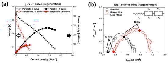After the characterizations, regeneration evaluations were carried out. For regeneration, it is essential to remove the Na and Cl in fuel cells that adversely affect the PEMFCs. Pure DI water was supplied to remove Na and Cl. The Pt catalyst, GDL, gasket, and flow field were cleaned by supplying DI water to the cathode of the fuel cell. In addition, it was operated for 5 h in the high current region (0.4 V) to use the water generated by electrochemical reactions. The j-V-P curves of the regenerated PEMFCs are shown in Figure 5a. Notably, there were differences in recovery according to the flow field of the fuel cells. The maximum power density of the PEMFC using the parallel flow field was 274 mW/cm2 (+3.29 mW/cm2) after regeneration, which was recovered by 1.21%. However, the PEMFC with the serpentine flow field achieved 52.96% recovered performance, from 64.95 to 99.4 mW/cm2 (+34.4 mW/cm2). The PEMFC with the serpentine flow field was recovered around 3.5 times more than the PEMFC with the parallel flow field. Figure 5b shows Nyquist plots of the PEMFC after the regeneration process measured at 0.5 V. Interestingly, the ohmic resistance was not discernibly recovered; however, the faradaic resistance of the fuel cell was significantly decreased, i.e., recovered. The faradaic resistance of the parallel flow field was reduced to 0.786 Ω∙cm2 (−0.1 Ω∙cm2) from 0.886 Ω∙cm2, recovering 7.46%. Furthermore, the faradaic resistance of the serpentine flow field was recovered by 77.90%, from 3.269 to 1.137 Ω∙cm2 (−2.132 Ω∙cm2). The faradaic resistance decreased in both the parallel and serpentine flow fields with the DI water supply.