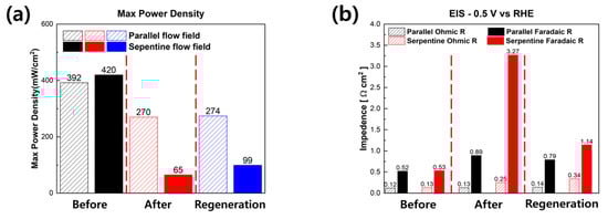 A summary of the EIS analysis results is shown in Figure 6b. After long-term durability evaluation, the faradaic resistances of the fuel cells were dramatically increased. Particularly, the faradaic resistance of the PEMFC with the serpentine flow field was increased by almost 6 times. Interestingly, after the regeneration experiments, which were carried out at a 0.4 V constant voltage mode with DI water, the faradaic resistances of the fuel cells were decreased. In particular, the faradaic resistance of the fuel cell with the serpentine flow field decreased by 77.90%. Therefore, the performance of the fuel cell with the serpentine flow field was increased to 99.4 from 64.95 mW/cm2.