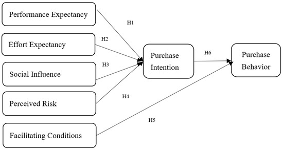 This research is based on the UTAUT model. Venkatesh et al. (2003) [13] proved that this model has a strong explanatory power for consumers’ willingness to accept new technologies in the organizational context. The UTAUT model refines the factors that affect consumer behavior intentions into four core independent variables, namely, performance expectancy (PE), effort expectancy (EE), social influence (SI), and facilitating conditions (FC). Scholars often use the UTAUT model in studying the user intention and behavior of various information technology systems. For example, Celik (2016) [14] used the UTAUT model to explore the effects of anxiety on customers’ adoption of online shopping. Nur and Panggabean (2021) [15] used the extended UTAUT model to analyze the factors affecting the adoption of mobile payment as a payment method in Generation Z. Chen et al. (2021) [16] used the UTAUT model to explore the determinants of purchase intention when using the fresh e-commerce platform.