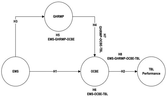 Chang et al. [] conducted a study in which they found that OCBE mediates the relationship between green organizational identity, shared vision, and green product development performance of the firm. Malaysian researchers [] confirmed a mediational effect of OCBE on the relationship between green competence-building practices, green motivation, green employee involvement practices, and environmental performance in the Malaysian higher education sector. We summarize our prior discussion and propose hypothesis H6: OCBE mediates the relationship between EMS and TBL; H7: OCBE mediates the relationship between green HRM practices and TBL; and H8: green HRM practices and OCBE serially mediate the relationship between EMS and TBL performance among ISO14001 certified firms.