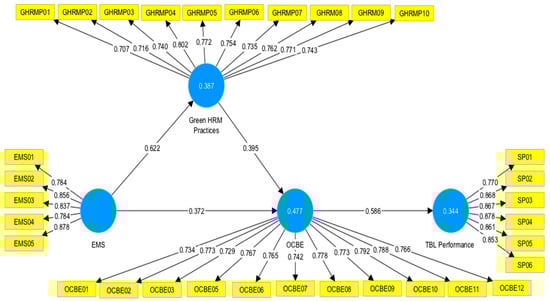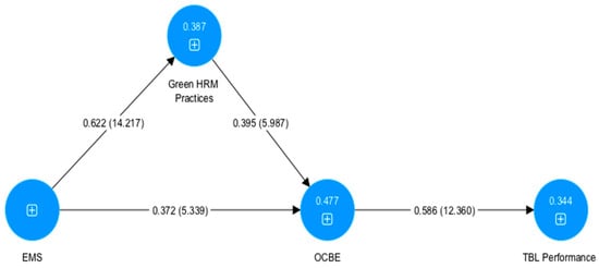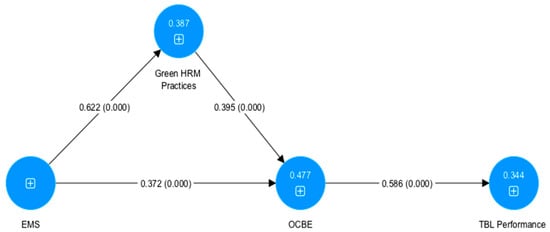 The R2 value explains how many endogenous variables, e.g., (green HRM practices, OCBE, and TBL) are explained by exogenous variables in the current model. The R2 value for the green HRM practices was 0.387, implying that 38% explain by EMS as an exogenous variable. The details of other variables, e.g., OCBE, and TBL, are given in Table 4.