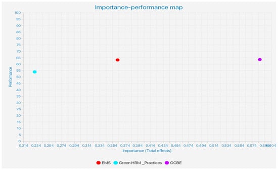 The importance–performance matrix analysis (IPMA) assessed the performance matrix for the endogenous variable (TBL) and how all exogenous variables, e.g., EMS, green HRM practices, and OCBE primarily contribute to TBL. The values were calculated using PLS-SEM IPMA. For example, the value of OCBE (63.534) is the highest of all. E.g., the values for EMS (63.207) and green HRM practices (53.890) are highlighted in Figure 5.