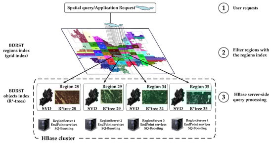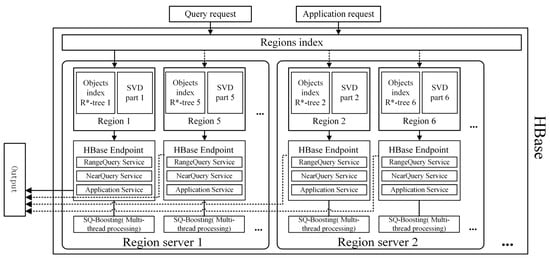 The whole spatial-processing method is solely based on HBase. A BDRST index consisting of the regions index and objects index is proposed and localized along with SVD partitions in regions of an HBase table to avoid cross-platform and cross-table access. As Figure 2 shows, the regions index records the identifiers and spatial extents of regions for region-level filtering. An objects index is an R*-tree in each region to filter the indexed spatial objects. Based on HBase coprocessor interfaces, we implement a parallel processing mechanism for R*-trees real-time loading, data retrieving, query processing, and application in qualified regions on region servers. To further improve the efficiency, a second-stage boosting mechanism (SQ-Boosting) is incorporated as it accelerates each processing task with multi-thread processing.