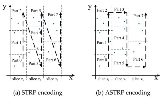 Comparison of spatial encoding strategies for partitions in STRP (a) and ASTRP (b).