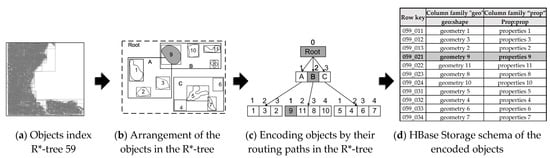 The length of code depends on the max depth of the R*-trees in the BDRST index since it encodes spatial objects with their routing paths in the R*-tree (Figure 5). An R*-tree clusters near spatial objects to a node, hence objects in the same node tend to be closer to each other. Based on that, we descend the R*-tree and retrieve the identifiers from every node of each spatial object and concatenate these qualifiers as code. All the R*-trees in the BDRST index have the same depth due to the ASTRP process. In an R*-tree, the indexed entries are children of leaf nodes, so we set the length of the code part to (Equation (1)). To illustrate, the code of geometry nine in Figure 5 is “021”.