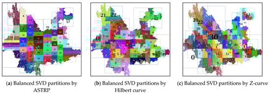In the HBase table, rows are alphabetically sorted by the ASCII codes of their row keys. A HBase table can be split by the user-defined splits schema of certain row keys. To generate regions corresponding with pre-balanced partitions by ASTRP, the row keys are mostly in the form of “partid_code” where partid is the partition identifier and code is the spatial encoding. The only one exception is the row storing the regions index since its row key is the aforementioned “total_info”. To construct fixed-length keys, the partid must be left padded with zeros to the defined length (Equation (1)). For example, if an SVD has 99 partitions, the is 2. If is 100, the is 3.