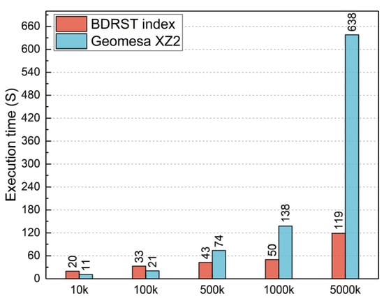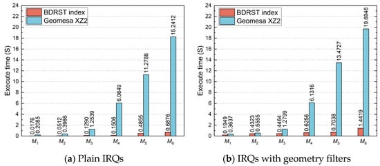 The numerical increases in execution time between the IRQs with geometry filters and plain IRQs of the BDRST index are smaller than that of Geomesa XZ2. As proof, the average additional time cost of the BDRST index is 0.39 s, while in Geomesa, this value is 0.68 s. Nevertheless, the proportional increases in the execution time for geometry filters in the BDRST index is bigger than Geomesa XZ2. According to Figure 10, we can calculate the proportion of the additional time for the IRQs with a geometry query by comparing with plain IRQs. This value is 44.96% on and 109.7% on . This suggests that the memory-based BDRST can directly process plain IRQs without accessing DTRs in HBase, while the IRQs with geometry filters demand accesses to DTRs to check the topological relations between intact geometries and the query geometry. Consequently, the I/O costs increase the processing time.