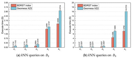 Figure 11 shows the average execution time for kNN queries with the BDRST index and Geomesa XZ2. The kNN-query performance gap between the BDRST index and Geomesa XZ2 is much smaller than the IRQs, which suggests that the BDRST index is more efficient for spatial range queries with rectangular query geometries. However, it still shows considerably high performance and scalability. On average, the execution time with the BDRST index is 50.1% of the Geomesa XZ2 on . The average execution time of all kNN queries with the BDRST index is 67.87% of Geomesa’s on and 49.16% on the larger dataset , which shows the better scalability of the BDRST index.
