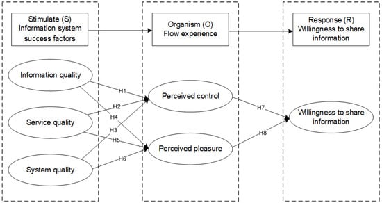 The willingness to share information as an individual’s dynamic behavior is closely related to the user’s flow experience. It has been shown that the duration and intensity of a user’s flow experience has an impact on their willingness to share. In the research on the information-sharing behavior of social networking sites (SNS), it has been found that user perception control plays a significant role in promoting user information-sharing behavior [49]. Perceived pleasure emphasizes personal feelings and is an intrinsic motivator for action. Users receive information and services in such a way that their expectations are met, which in turn leads to pleasurable emotions. Savolainen (2015) found that positive emotions can stimulate individuals to seek and share information [50]. The success factors of the information system allow people to recognize the operational experience, information, and services given by the platform, creating a sense of control and pleasure. As a result, they will take the initiative to share information. As such, we hypothesized: