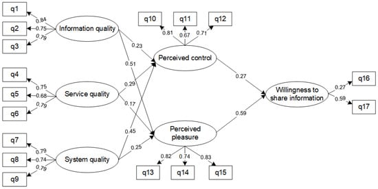The factor loads of information quality, service quality, system quality, perceived control, perceived pleasure, and willingness to share information in the scale were all greater than 0.6, as shown in Table 2. This indicated that the latent variables were highly representative of the topics to which they belonged. In addition, the AVE value of each latent variable was more significant than 0.5, and the composite reliability CR was more significant than 0.7, indicating that the observation indicators had good consistency and that the convergent validity of the data was ideal. Finally, a discriminant validity test of the observed variables was carried out. The results are shown in Table 3. The square root of the AVE value of each variable was significantly larger than the correlation coefficient between the observed variables. This indicated that the scale had good discriminant validity. In conclusion, the data of this questionnaire passed the reliability and validity tests.