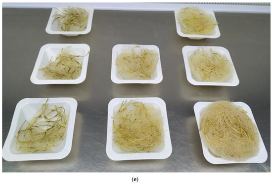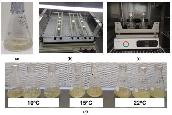 (a) Adventitious in vitro roots of Primula veris subsp. veris cultured in 250 mL Erlenmeyer flasks containing 100 mL of liquid MS medium enriched with 5.4 μM NAA, 0.5 μM kinetin, 100 mg/L L-proline, and 30 g/L sucrose (pH: 5.8) at the initiation of the experiment on day 0; (b,c) In vitro roots agitated on continuous rotary shakers (120 rpm) under 24 h dark; (d,e) Biomass growth and species-specific secondary metabolites’ production of adventitious roots after 60 days of in vitro culture under three different temperatures (10, 15, 22 °C) inside and outside flasks, respectively.