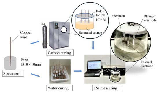 The carbon-curing group was for a simulation of newly mixed concrete or recycled concrete aggregates in the carbon-capturing process. After demolding, the specimens with copper wire electrodes were placed in the carbon-curing chamber and the concrete standard curing chamber. The parameters of carbon curing were as follows: relative humidity 70 ± 2%, CO2 concentration 20 ± 2%, temperature 20 ± 2 °C, and pressure 2 bar. The parameters of standard curing were: relative humidity 98 ± 2% and temperature 20 ± 2 °C. It is noteworthy that specimens in the carbonation group were placed in a plastic box with a layer of saturated sponge placed at the bottom of the box to ensure the hydration of cement. Small 1 mm holes were drilled on the box cover to let the CO2 flow and keep the CO2 concentration in the box stable at about 20%. The EIS of specimens was tested at the curing ages of 1, 3, 7, 14, 28, and 56th days. The flow chart of this study is shown in Figure 1.
