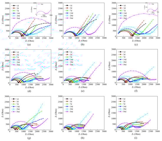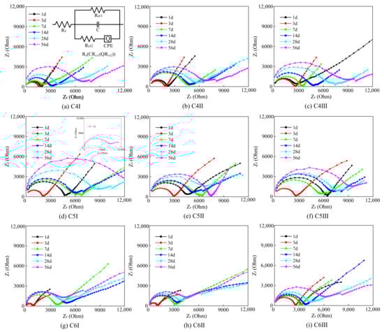The impedance spectroscopy curves are composed of a semicircular arc and a straight line, in which the high frequency region is the circular arc, and the low-frequency region is the straight line. The starting point of the high frequency arc approximates the zero point, which is consistent with the characteristics of the impedance spectroscopy curve of cement-based composites [26].