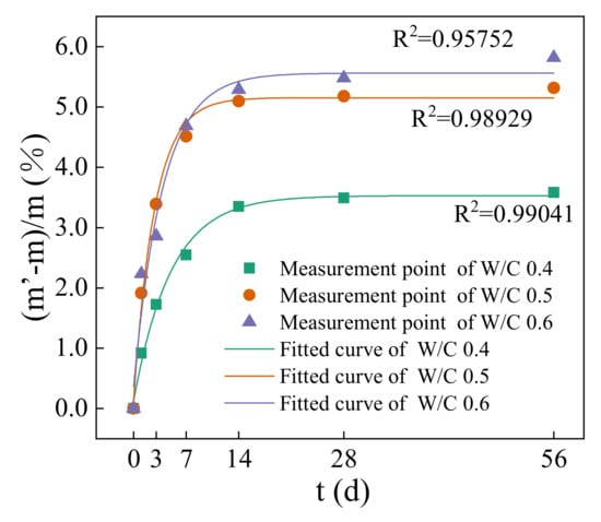 In the carbonation curing process of cement-based materials, the two basic reactions of carbonation and hydration develop in a coupling way. The evolution of the specimens’ microstructure is mainly determined by the ratio of dynamics in the two reaction processes [34]. According to the test of weight-increasing rate in the hydration process, the mass-increasing rates of the three kinds of water–cement ratio specimens were about 0.5%, 1.0%, and 1.5% after 3, 7, and 14 days of hydration curing, and then tended to be stable. According to the literature [35], the hydration degree of cement paste can reach 80% on the 7th day, after which the hydration slows down and starts to stabilize. The increase of mass change on the 7th to 21st day had no obvious change compared with that on the 7th day. In Figure 4, after 14 days of carbon curing, the mass increase rates of specimens with water–cement ratios of 0.4, 0.5, and 0.6 were basically stable at 3.4%, 5.0%, and 5.5%, respectively. It can be seen from the comparison that the mass increase rates of carbonation were 1.9%, 3.5%, and 4%, respectively. Of course, the carbonation reaction and hydration reaction cannot be completely split, and the mass increase rate cannot be simply considered as the carbonation mass increase rate. Even in a dry environment, the carbonation reaction process itself will generate water, which provides the demand for the hydration reaction [18].