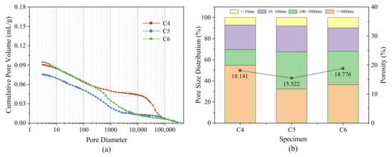 Cumulative pore volume and pore structure distribution of C4, C5, and C6 groups after curing for 56 days: (a) cumulative pore volume curve; (b) pore structure distribution.