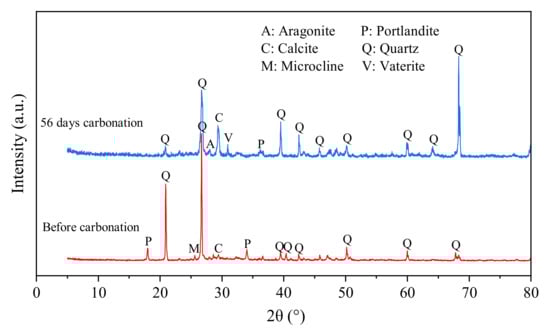 XRD detection can study the phase composition of materials, and the XRD spectra that simulate cementitious materials to capture CO2 were collected as shown in Figure 6. Comparing the uncarbonated sample with the 56-days-carbonated sample, the diffraction peaks of portlandite (2θ at about 18° and 34°) were observed in the XRD patterns of the uncarbonated one, as expected. For the carbonated sample, the peaks of calcium hydroxide decreased significantly. In addition, microcline and calcite were detected at about 26° and 29°, respectively, for the uncarbonated one. However, the peak height of these crystals was low, indicating that the sample had been carbonized during making, and the carbonation process was not high [44]. Another obvious difference is that the carbonized specimen generated ore crystals such as calcite and vaterite, indicating that under long-term carbonation curing, the carbonation products converted from the main calcium carbonate calcite into a more stable crystal state, vaterite, which is conducive to a denser microstructure [45].