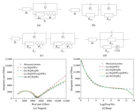 The comparison of fitting results of the above models is shown in Figure 7e,f; the former is a Nyquist plot, reflecting the relationship between the real part and the imaginary part of the impedance of the specimen at different frequencies, and the latter is a Bode phase diagram. The curve describes the relationship between the impedance modulus and frequency. Both of the above diagrams show that the used model had a good fitting effect.