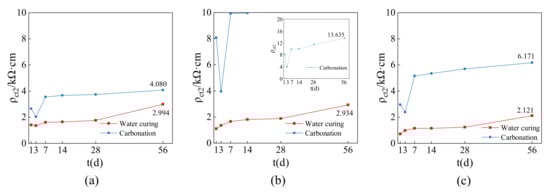 Figure 2 shows the EIS curve of each group of specimens with the increase of carbon curing age. The real part and imaginary part of impedance are characterized by resistivity, and the following equation was used for conversion between resistivity and resistance: