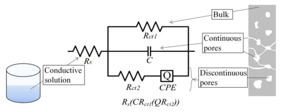 Cement-based materials have remarkable porous properties, and their pore structure exhibits certain fractal characteristics [50]. In order to study the evolution of the pore structure of cement-based materials by the impedance method, it is necessary to explain the “penetration” ability of the AC signals emitted by the workstation in the pore structure by simulating the circuit parameters into the internal pore structure of the working electrode, that is, the specimen. The electrical transmission types of AC signals in porous media can be divided into three categories, as shown in Figure 9. The principle of pore structure network shows cement matrix, continuous pore, and discontinuous pore. In fact, pore structure can also be classified by pore size [51].