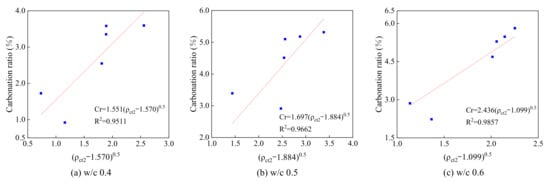 Relationship between ρct2 and carbonation ratio: (a) w/c 0.4; (b) w/c 0.5; (c) w/c 0.6.