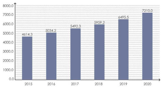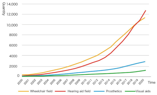 In recent years, the Chinese government has vigorously promoted the development of the rehabilitation assistive device industry [4]. China’s rehabilitation assistive device industry has been significantly improved in terms of scale and quantity (as shown in Figure 1), product types and supply capacity.