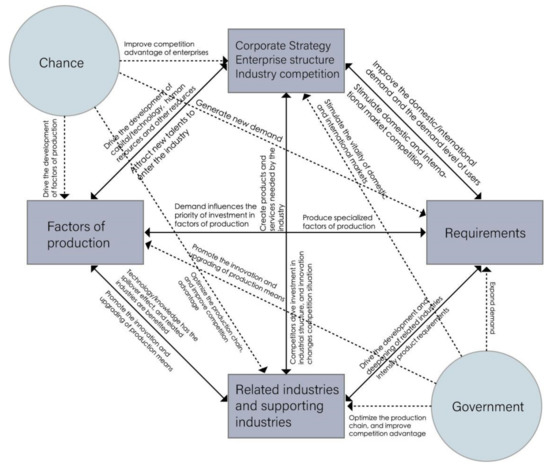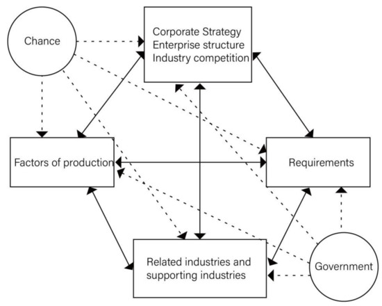 Although the starting point of Porter’s diamond model is to analyze the international competitiveness of a certain industry in a country, in the process of continuous evolution and development, the diamond model has already been used to study the development status and prospects of a certain industry in a country [44,45,46,47,48,49,50,51] and standardize relevant strategies and plans from the macro level to guide the development direction of the industry through the government’s institutional design [52].